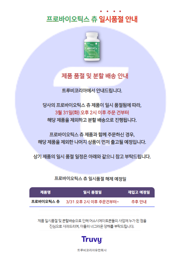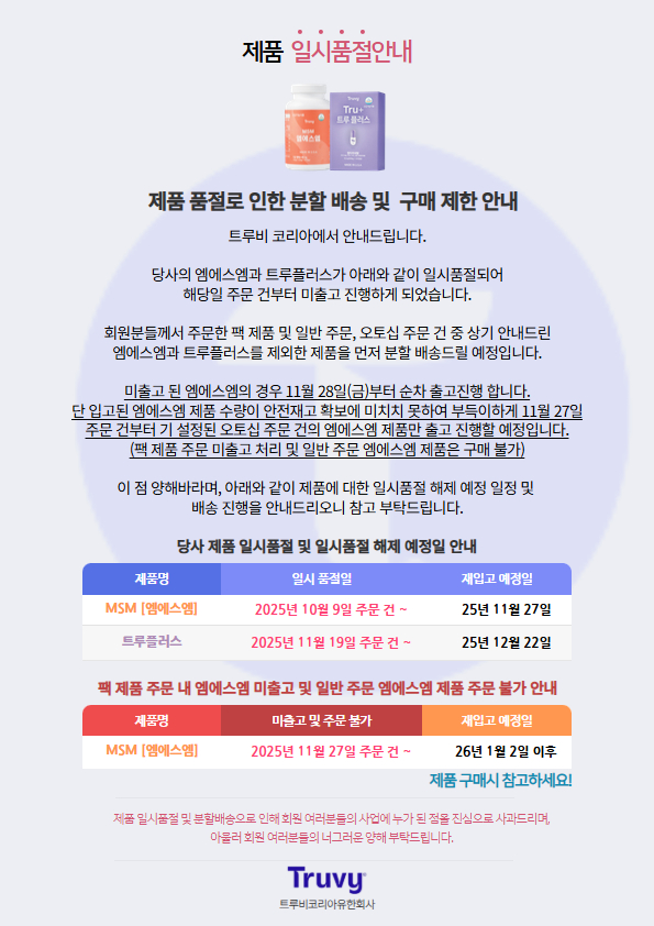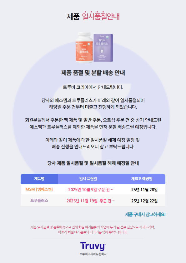 회사소개 회사소개 회장님 인사말 이사진소개 자체 공장 소개 진출 국가 오시는길 비지니스 마케팅플랜 회원 관리규정 청약철회규정 제품소개 레트릭 (Letric) 프로바이오틱스 츄 (Probiotics Chews) 엠에스엠 (MSM) 트루 플러스 (Tru+) 프로젠 (Pro-Gen) 트루카페 (TruCafe) 뷔플러스 (Vy +) 쇼핑몰 영양/건강 건강식품 뷰티 화장품 패키지(진입팩) 패키지(프로모션) 발행물 트루카페 고객센터 이벤트 프로모션 공지사항 자료실 마이오피스 로그인 회원가입 아이디/비밀번호 찾기 마이오피스
